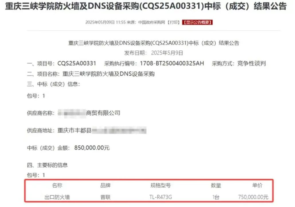 据中国政府采购网2025年5月9日发布的《重庆三峡学院防火墙及DNS设备采购(CQS25A00331)中标(成交)结果公告》显示,主要标的信息中,出口防火墙一栏,显示采购产品为1台“普联TL-R473G”,其单价为75万元。中标信息则显示,供应商为重庆丰都县某商贸有限公司。